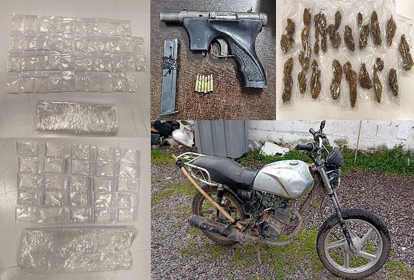 Durante la intervención, se decomisaron más de 80 envoltorios con posible droga, seis cartuchos útiles de uso exclusivo del Ejército, un arma de fuego de fabricación casera, dinero en efectivo y una motocicleta. Estos objetos quedaron bajo resguardo de las autoridades para continuar con las investigaciones.