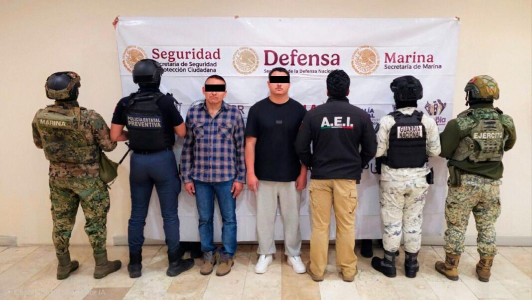 Durante la intervención en el municipio de San Matías Tlalancaleca, fueron detenidos Osiel N., de 49 años, y Mauricio N., alias “El Caballero”, de 28 años, originarios del Estado de México y la Ciudad de México.