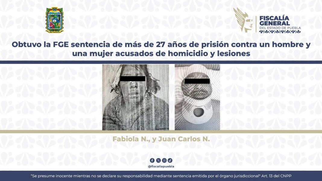 La Fiscalía General del Estado de Puebla (FGE) obtuvo una sentencia condenatoria de más de 27 años de prisión contra Fabiola N. y Juan Carlos N., tras demostrarse plenamente su responsabilidad en los delitos de homicidio y lesiones calificadas. La resolución se alcanzó gracias a evidencias periciales, técnicas y científicas que fortalecieron la teoría del caso del Ministerio Público.