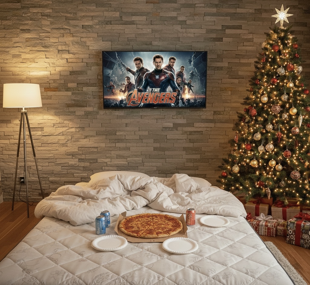 Recordamos esa tarde de pizza y televisión, y una Nochebuena con las vacas flacas optamos por lo mismo: llamamos a Domino’s, movimos los sillones, pusimos el colchón frente a la tele y nos aventamos un maratón de Avengers. La pasamos tan bien que repetimos el ritual en Año Nuevo.