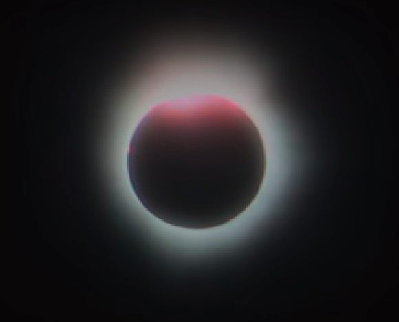 A las 11:09 las exclamaciones iniciaron y la emoción permeaba el lugar: en 35 segundos la ansiada totalidad sería un hecho. La temperatura bajó hasta sentirse un poco de frío y la oscuridad era similar a la que se observaría en abril cerca de las 20 horas. El momento esperado por años se manifestó con una brillante corona acompañada, al suroeste, de una protuberancia que se apreciaba amarillenta a simple vista. Éstas son grandes estructuras gaseosas situada sobre la superficie del Sol, casi siempre en forma de bucle.