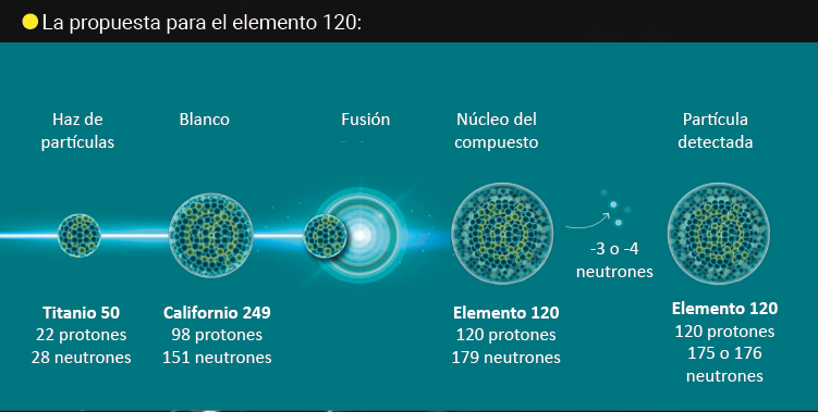 Se trata de bombardear otros átomos con Titanio 50 calentado a más de mil setecientos Celsius y canalizados para formar un haz intenso e inusual. La idea más concreta consiste en hacer chocar al Titanio contra Californio cuyo número atómico, –es decir el número de protones–, es 98. De esa manera, la unión de 98 protones del Californio con 22 del Titanio producirán el nuevo átomo con 120.