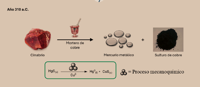 La historia ha registrado otros ejemplos donde la mecanoquímica claramente entra en acción. Como ya se mencionó arriba, en la antigüedad Aristóteles sostuvo que “ninguna reacción procede en ausencia de disolvente”; sin embargo, su discípulo Teofrasto de Ereso en su obra “Sobre las piedras” (310 a.C.) presenta observaciones que contradicen dicha aseveración. En particular, describe una transformación química sorprendente: al macerar el mineral cinabrio (sulfuro de mercurio, HgS) en un mortero de cobre, aparecen pequeñas gotas de mercurio metálico (“plata líquida”, como era llamado en la antigüedad). ¡La simple molienda de cinabrio sólido en contacto con el metal cobre permite generar el mercurio y sulfuro de cobre sin necesidad de utilizar disolventes! (Figura 2).