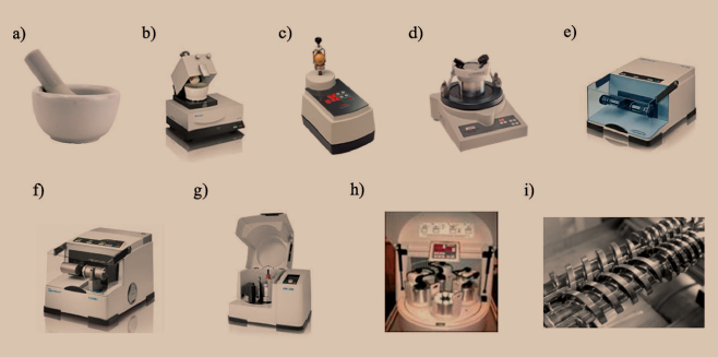 Figura 3. Equipos de molienda más comunes. a) Mortero y pistilo. b) Mini mortero automático (Retsch). c) Mini molino vibratorio vertical (Fritsch). d) Micro molino vibratorio (Fritsch). e) Molino vibratorio de bolas (Retsch). f) Molino vibratorio de bolas con control de temperatura (Retsch, Cryomill). g) Molino planetario de bolas (Retsch). h) Molino con multimuestreador (Automaxion). i) Tornillo gemelo de uso en procesos mecanoquímicos en flujo continuo. Reproducido con permiso de la American Chemical Society (ACS Sustainable Chem. Eng. 2020, 8, 8881).