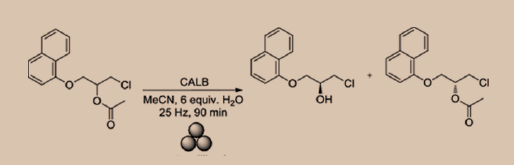 Al emplear enzimas en procesos químicos en ausencia de disolventes, se satisfacen varios principios de la Química Verde, lo que hace de la mecanoenzimología una herramienta poderosa para la síntesis sustentable. En este contexto, una de las enzimas más utilizadas en la industria farmacéutica es la lipasa B de Candida antarctica (CALB). En nuestro laboratorio, se ha aprovechado las propiedades de esta enzima para resolver mezclas racémicas; es decir, para separar mezclas racémicas en los enantiómeros individuales.