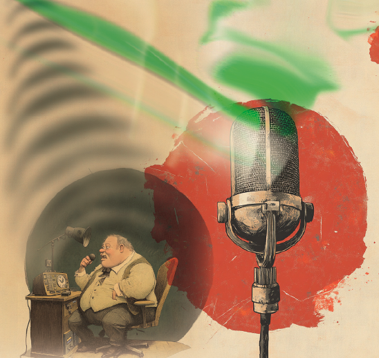 El interlocutor le hace una señal al técnico de sonido. Éste aprovecha para intercalar el gruñido de los goznes de una puerta, que tiene en la biblioteca de sonidos de la emisora.