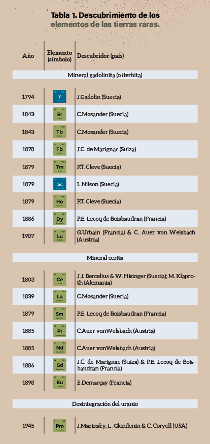 Cuando Dimitri Ivánovich Mendeléyev presentó su sistema periódico (1869), solo seis de los diecisiete elementos pertenecientes a las tierras raras habían sido descubiertos. Para Mendeléyev, cada descubrimiento de un nuevo elemento de tierras raras suponía un nuevo enigma, ya que cada uno mostraba un comportamiento químico muy similar que dificultaba la asignación de posiciones en su tabla periódica.
