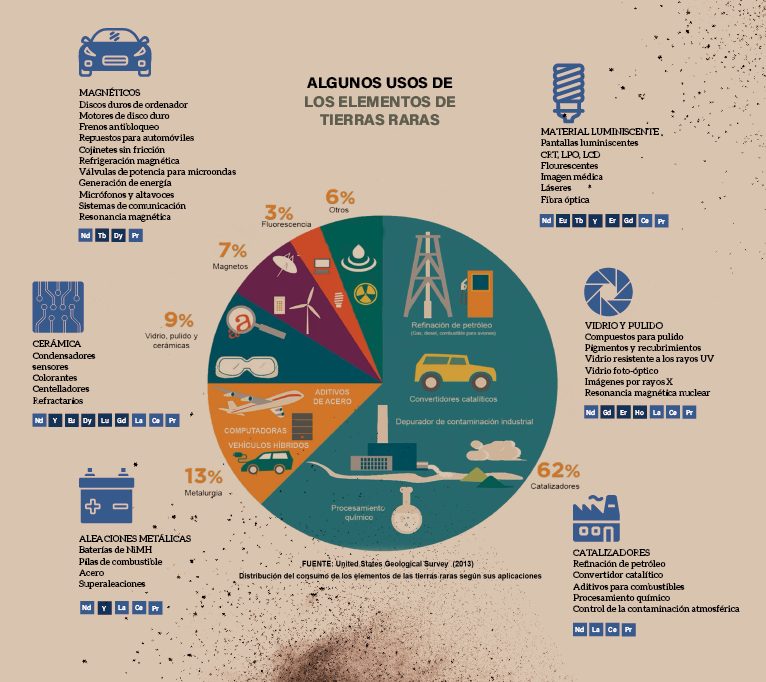 Las propiedades químicas de las tierras raras son muy parecidas, pero no las físicas, lo que explica la especificidad de sus propiedades ópticas y magnéticas. En el mercado de consumo no existe una clasificación uniforme para las aplicaciones de tierras raras y se suelen agrupar siguiendo nueve sectores: baterías, aditivo para vidrios, catalizadores (refinado del petróleo, vehículos), cerámica, imanes, metalurgia (aleaciones…), pigmentos y luminiscentes (láser, iluminación, pantallas LCD…), pulido y otros.