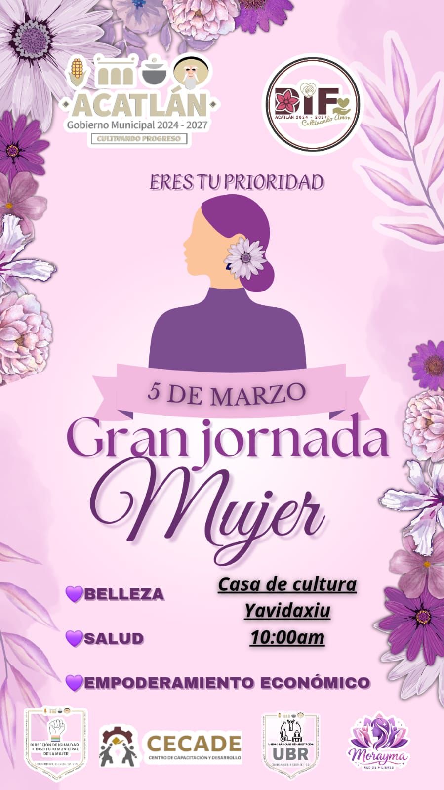 El Gobierno Municipal de Acatlán dio a conocer el programa de actividades que se realizará en el marco del Día Internacional de la Mujer, una agenda que contempla una semana de eventos enfocados en la reflexión, la cultura y el diálogo.