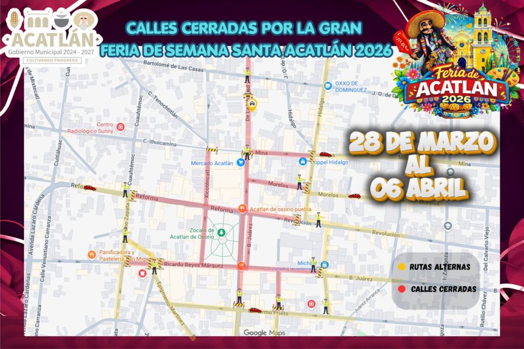 Con el objetivo de garantizar la seguridad y una mejor distribución de espacios, el Gobierno Municipal de Acatlán informó sobre el cierre temporal de calles en zonas cercanas al recinto ferial y al centro del municipio. Estas medidas forman parte de los preparativos para la Gran Feria de Semana Santa 2026.