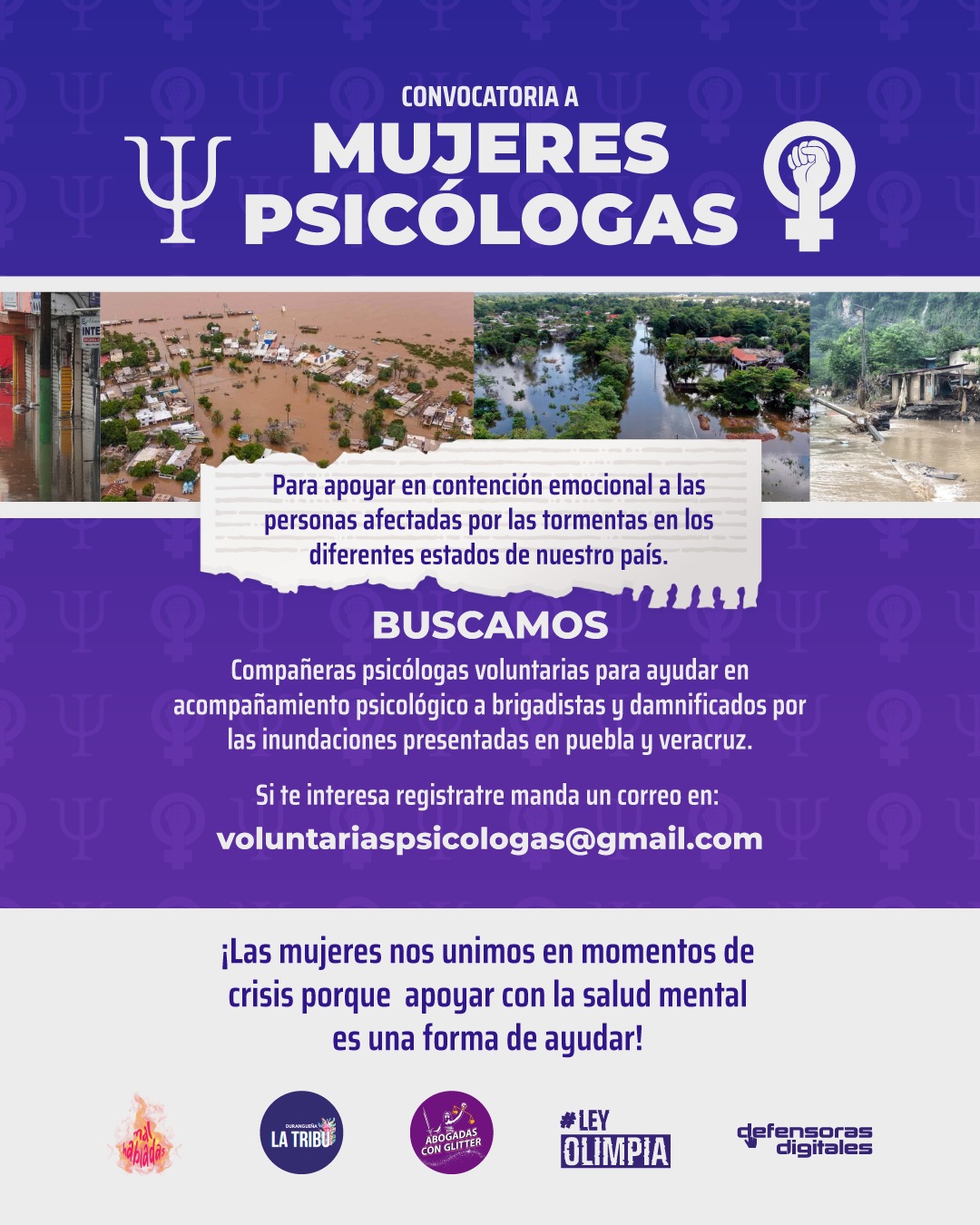 Ante las afectaciones que dejaron las recientes tormentas e inundaciones en distintas regiones del país, especialmente en Puebla y Veracruz, distintos colectivos feministas lanzaron una convocatoria dirigida a psicólogas voluntarias interesadas en sumarse a labores de contención emocional y acompañamiento para damnificados y brigadistas que participan en las labores de rescate y apoyo.