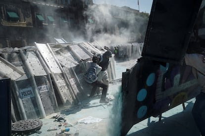 Cuando la marcha llegó al Zócalo, un grupo de como un centenar de jóvenes comenzaron a lanzar objetos por encima de las vallas que protegían el Palacio Nacional. La gente se dispersó en las entradas por el gas pimienta con el que respondió la policía. Los jóvenes encapuchados llegaron a romper algunas vallas y lanzaron petardos mientras los manifestantes vestidos de blanco observaban a la distancia.