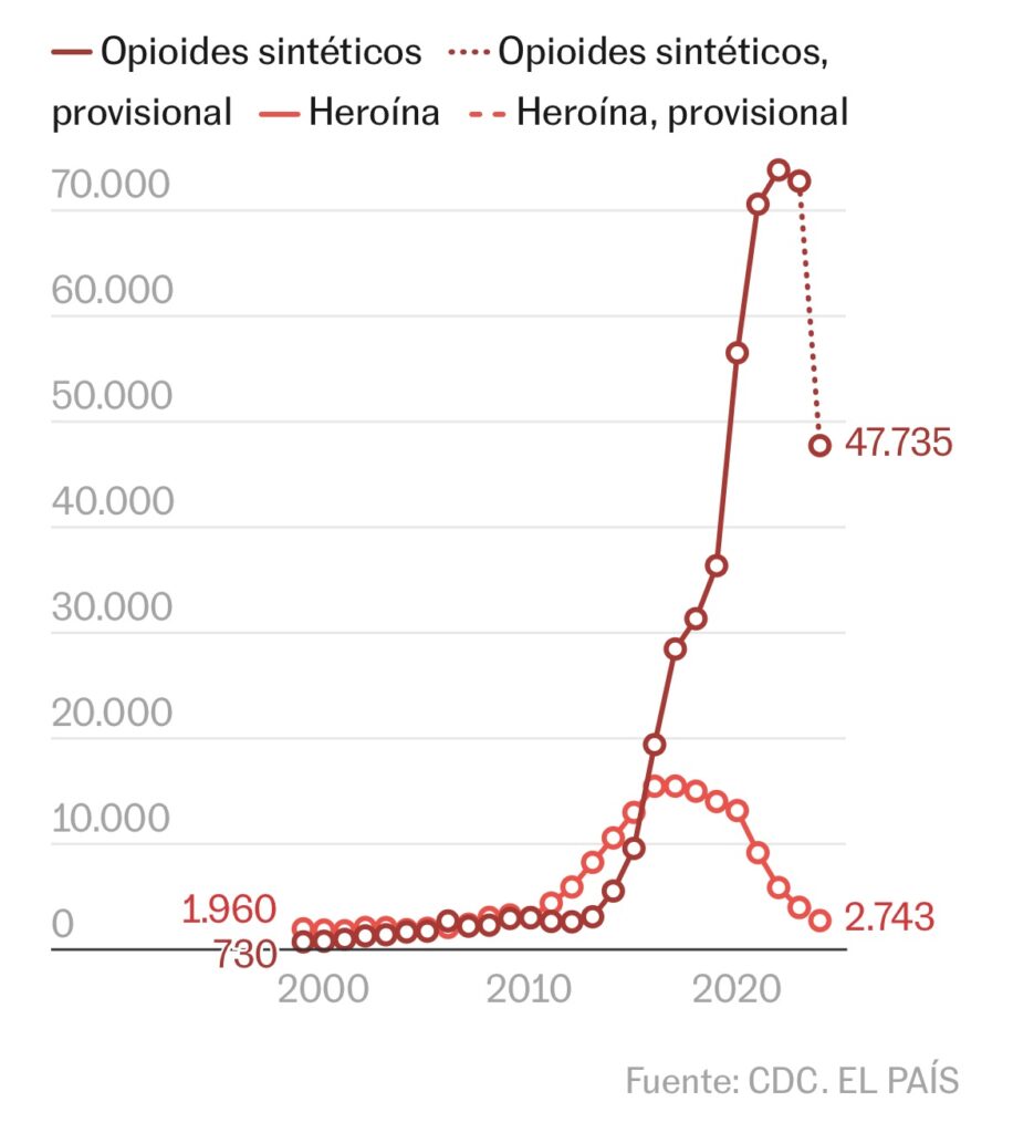 Las muertes por sobredosis de fentanilo en Estados Unidos se redujeron drásticamente a partir de 2024, en la recta final del Gobierno de López Obrador en México y del demócrata Joe Biden en EE UU. Ese año hubo 47.735 fallecimientos por esa causa, según datos preliminares de los Centros para el Control y Prevención de Enfermedades (CDC). La cifra es 35% menor a la de 2022, el peor año de la crisis desde el inicio del milenio, y cuando hubo 73.838 muertes relacionadas con el fentanilo. Esta reducción de fallecimientos no se veía desde 2019.