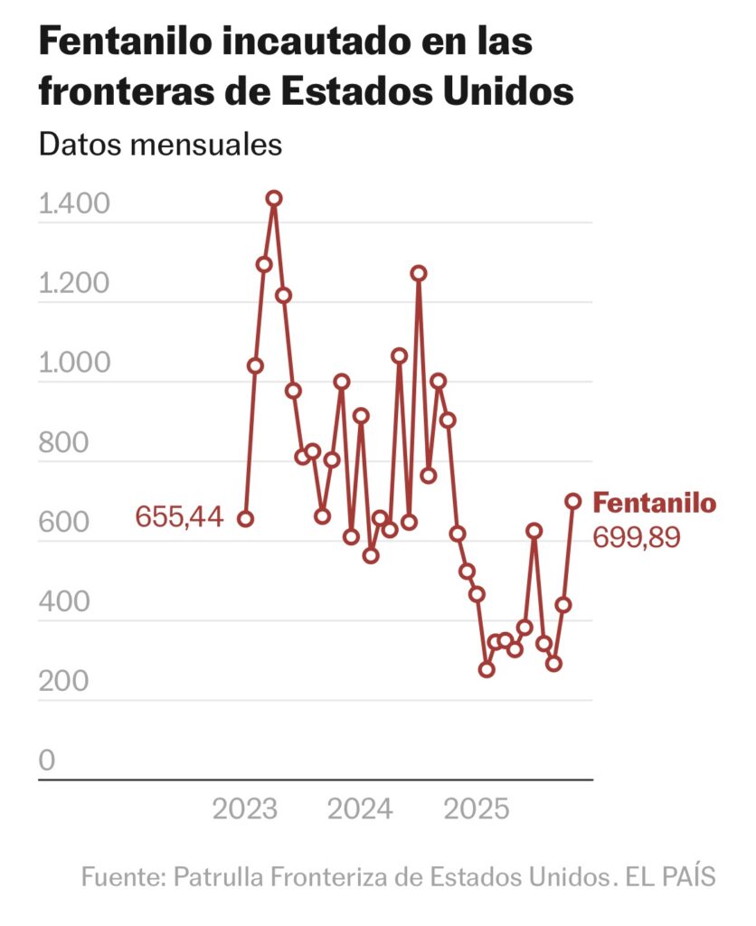 El efecto de la cruzada contra el fentanilo en México se ha traducido en un desplome de su trasiego a Estados Unidos. Según cifras de CBP, la agencia aduanera y de la Patrulla Fronteriza, en 2025 —sin contar diciembre— se aseguraron 4,5 toneladas de fentanilo en las fronteras de EE UU, 52% menos que en el año anterior, cuando se confiscaron 9,5 toneladas. El descenso se producía desde 2023, año en que se incautaron 11,3 toneladas del opioide sintético. El aseguramiento de cocaína también registró una caída de 14%. Hubo, sin embargo, un aumento del 9% en las incautaciones de metanfetamina, al pasar de 72 toneladas aseguradas en 2024 a 78,8 un año después. En el caso de la marihuana, en 2024 se confiscaron 77 toneladas, y en 2025, 87 (11% más).