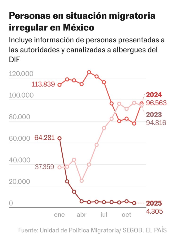 La migración irregular es otro de los ámbitos en los que hubo un balance positivo —conforme a las exigencias de Trump—. A noviembre de 2025, último mes del que se tiene registro oficial, México detuvo a 4.305 migrantes, 95% menos que en 2024, cuando las autoridades migratorias capturaron a 96.563 personas en situación irregular, de acuerdo con datos de la Secretaría de Gobernación.