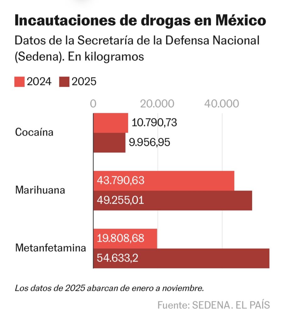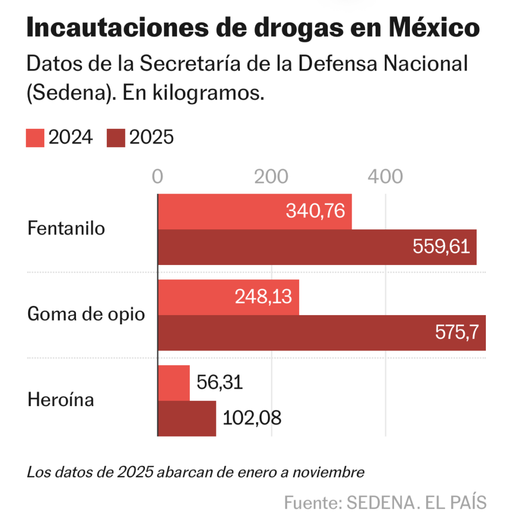 Tan solo el Ejército, según datos oficiales obtenidos por EL PAÍS, aseguró un tercio del total de fentanilo incautado en 2025 (559 kilos), cifra 65% mayor a lo decomisado en 2024 (340,7 kilos), el último año del sexenio de López Obrador. En el mismo periodo también hubo aumentos en los aseguramientos de metanfetamina (176%), marihuana (12%), heroína (82%) y goma de opio (132%) por parte del Ejército. Esas cifras se complementan con los decomisos efectuados por las otras instancias del Gabinete de Seguridad. Por ejemplo, en diciembre de 2024, a pocos meses de la toma de posesión de Sheinbaum de la presidencia, y un mes antes de la investidura de Trump, la Marina aseguró 1,5 toneladas de fentanilo, el mayor alijo de esa droga decomisado en la historia.