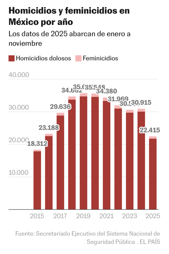 Como correlato de la lucha de México contra los carteles, la cifra de asesinatos también ha disminuido. En 2025 hubo 22.415 homicidios dolosos, cifra 27% menor a la del año anterior, cuando se registraron 30.063 homicidios. Se trata de la cifra más baja desde hace una década. Muchos de los asesinatos están vinculados con la criminalidad del narco, y la disminución no se puede explicar sin el cambio de enfoque en el combate a los carteles desde el Gobierno.