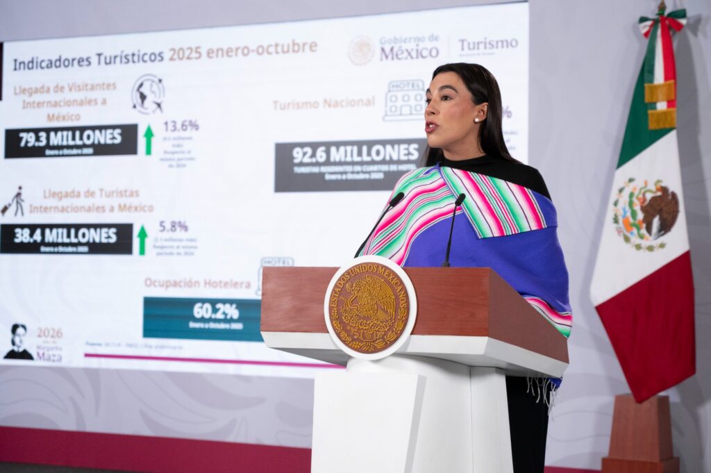 La secretaria de Turismo, Josefina Rodríguez Zamora, señaló que México recibió 79.3 millones de visitantes internacionales de enero a octubre de 2025, un incremento del 13.6% respecto a 2024. El turismo nacional registró 92.6 millones de visitantes, con una ocupación hotelera del 60.2%, 2.3 puntos porcentuales más que el año anterior.