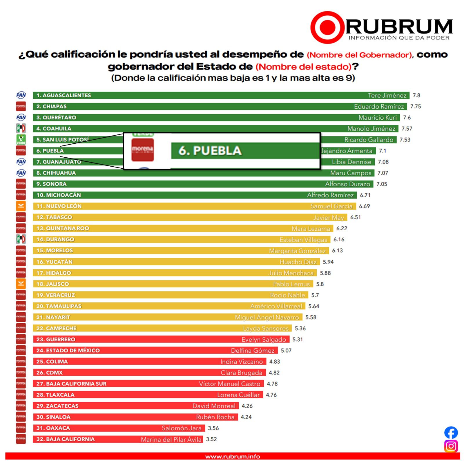 De acuerdo con la medición de Rubrum, el mandatario poblano aparece en el sexto lugar nacional en desempeño general, con una calificación de 7.1, posicionándose entre los mejores evaluados del país.