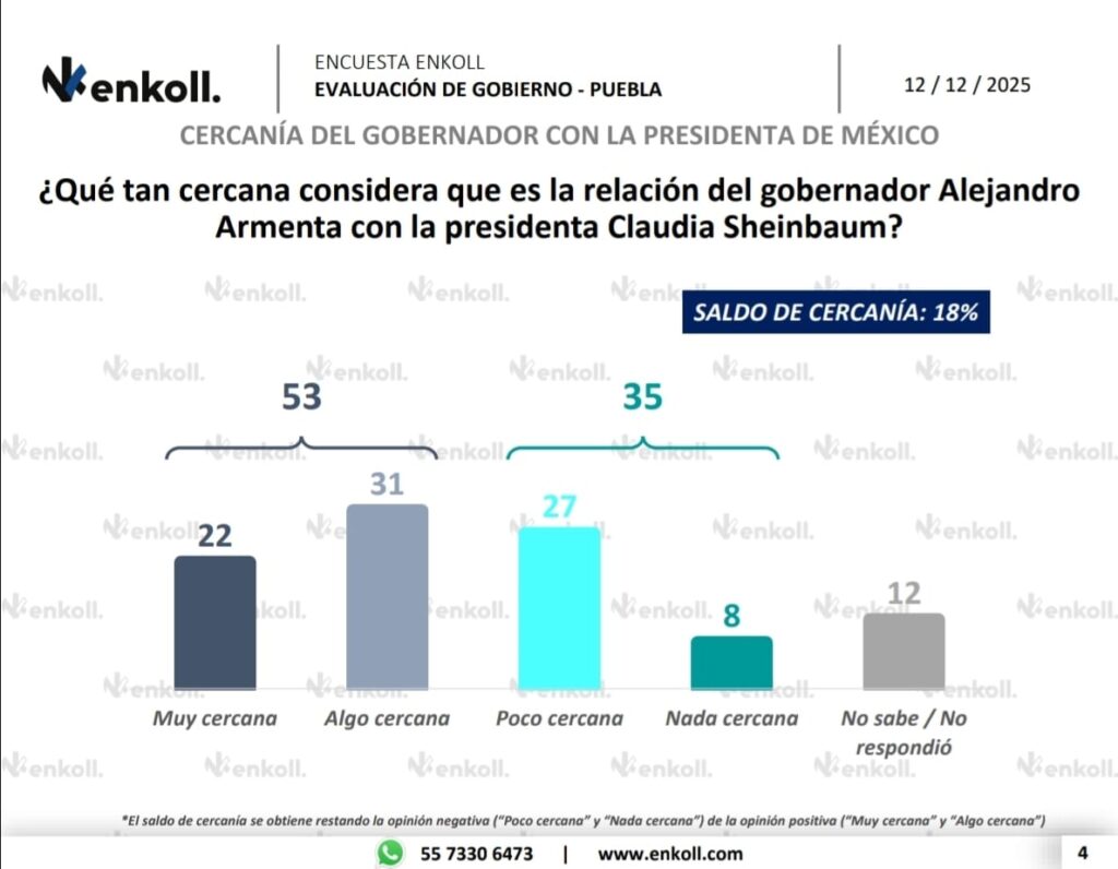 Otro de los aspectos evaluados fue la relación del gobernador con la presidenta de México, Claudia Sheinbaum. En este rubro, el 53% de las personas consultadas percibe una relación cercana, de las cuales el 22% la calificó como muy cercana y el 31% como algo cercana.