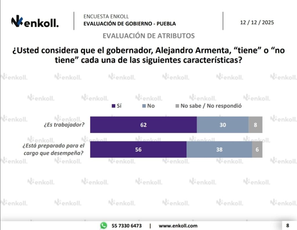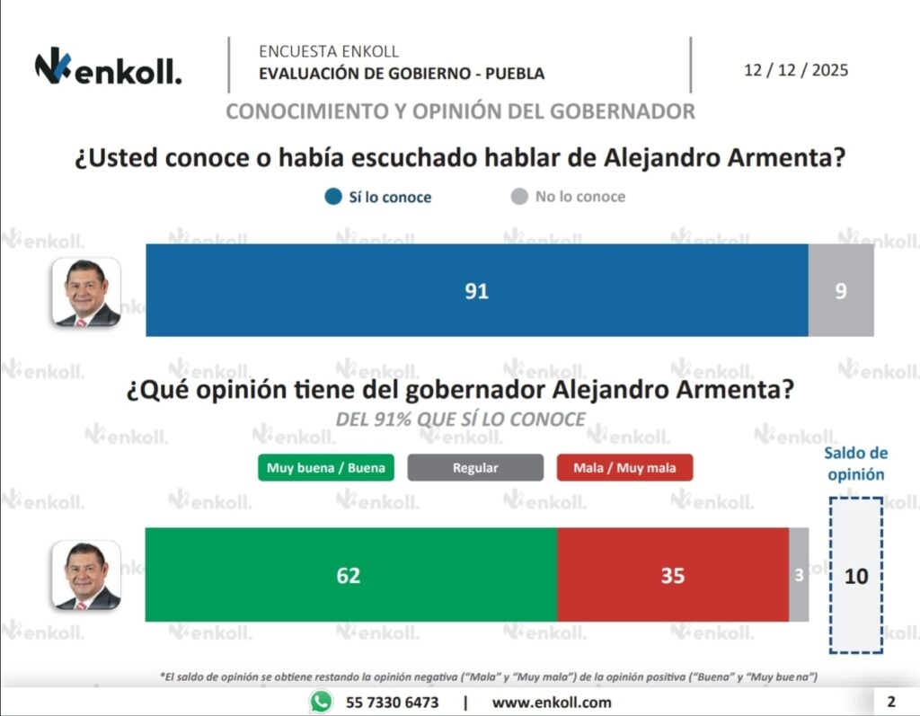 A un año de haber iniciado su administración, el gobernador de Puebla, Alejandro Armenta, mantuvo una evaluación mayoritariamente positiva entre la ciudadanía, de acuerdo con la más reciente encuesta de Enkoll sobre desempeño gubernamental en la entidad.