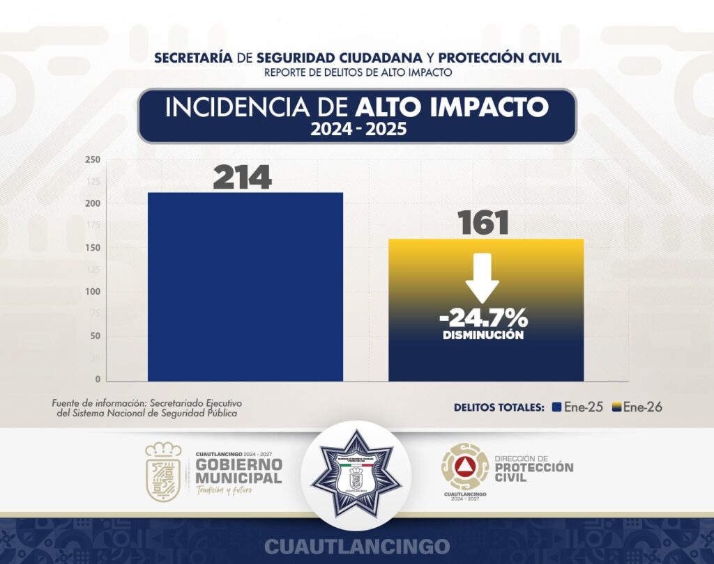 La incidencia de delitos de alto impacto en Cuautlancingo registró una disminución del 24.7% en enero de 2026, en comparación con el mismo mes de 2025, de acuerdo con datos del Secretariado Ejecutivo del Sistema Nacional de Seguridad Pública (SESNSP).