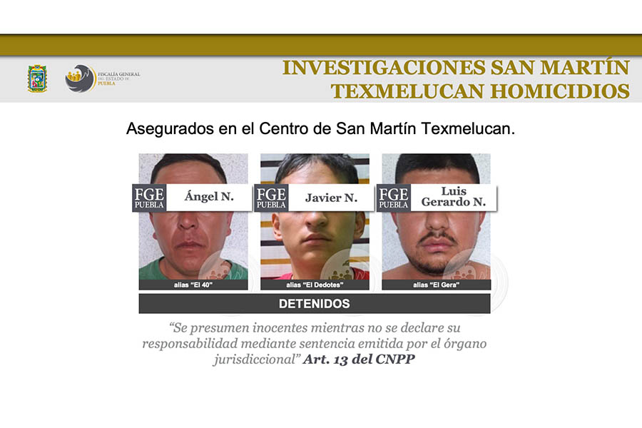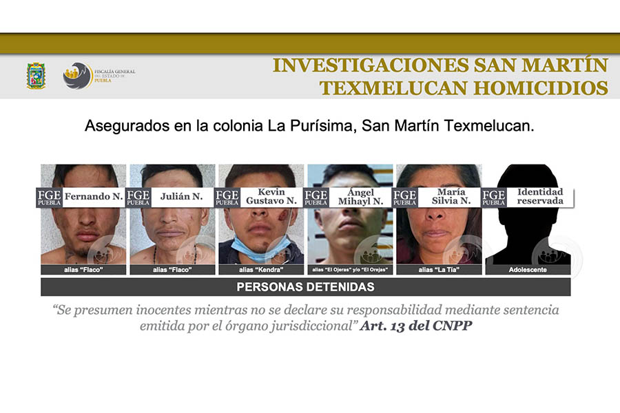 Nueve personas, entre ellas una mujer y un adolescente, fueron detenidas en el municipio de San Martín Texmelucan por la Fiscalía General del Estado (FGE), por su presunta relación con los recientes homicidios de dos personas y, además, por su responsabilidad en haber grabado un video en el que advirtieron a nombre del Cártel Jalisco Nueva Generación (CJNG) que realizarían una limpieza de bandas rivales.