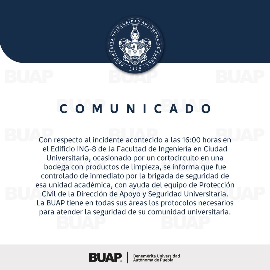 Un cortocircuito provocó un incendio en el edificio ING-8 de la Facultad de Ingeniería de la Benemérita Universidad Autónoma de Puebla (BUAP), el cual fue controlado por la Dirección de Apoyo y Seguridad Universitaria (DASU).