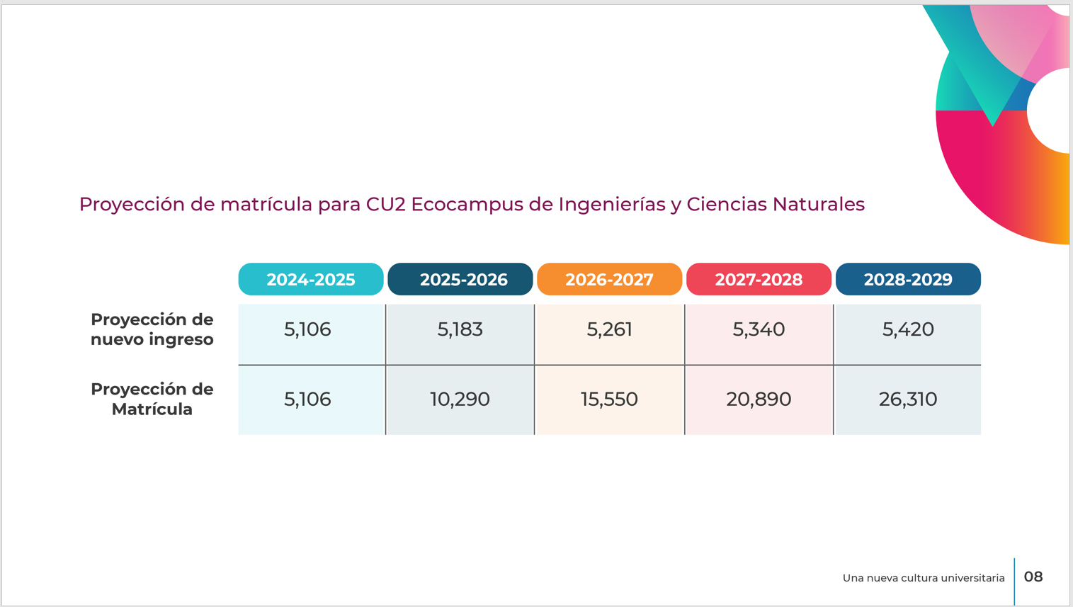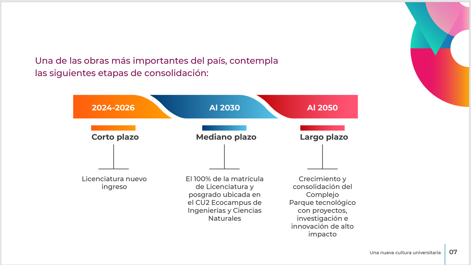 Su consolidación está planeada a corto plazo, entre 2024 y 2026, con la licenciatura de nuevo ingreso; hacia 2030 se prevé que 100 por ciento de la matrícula de licenciatura y posgrado esté trasladada a CU2, mientras que, a largo plazo, es decir, hacia 2050 se vislumbra el crecimiento y consolidación como un Complejo Parque Tecnológico con proyectos, investigación e innovación de alto impacto.
