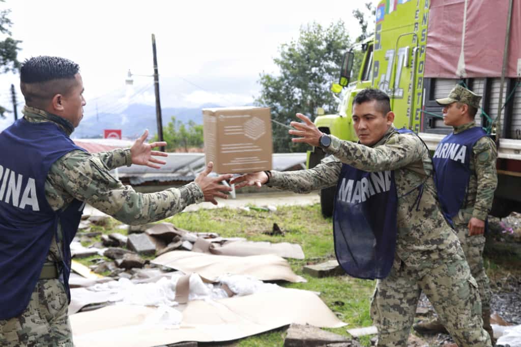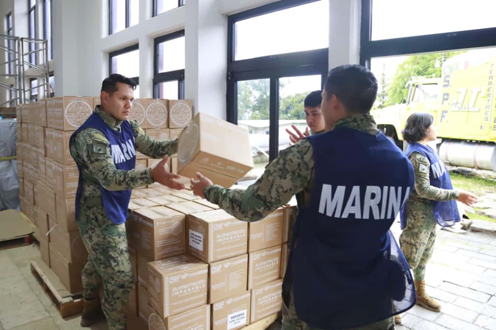 Durante la madrugada del sábado, los apoyos fueron recibidos en el recinto ferial de Huauchinango, donde decenas de personas colaboraron activamente en la descarga y organización de los paquetes alimentarios.