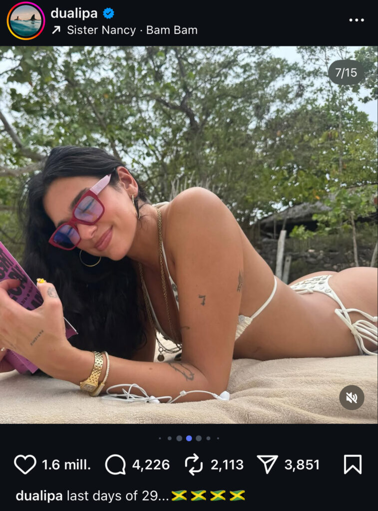 Para festejar, la estrella del pop decidió tomarse un respiro en Jamaica junto a su prometido, el actor británico Callum Turner. A través de sus redes sociales compartió imágenes en la playa, practicando esnórquel y disfrutando de la naturaleza, con mensajes que recuerdan sus “últimos días con 29”.