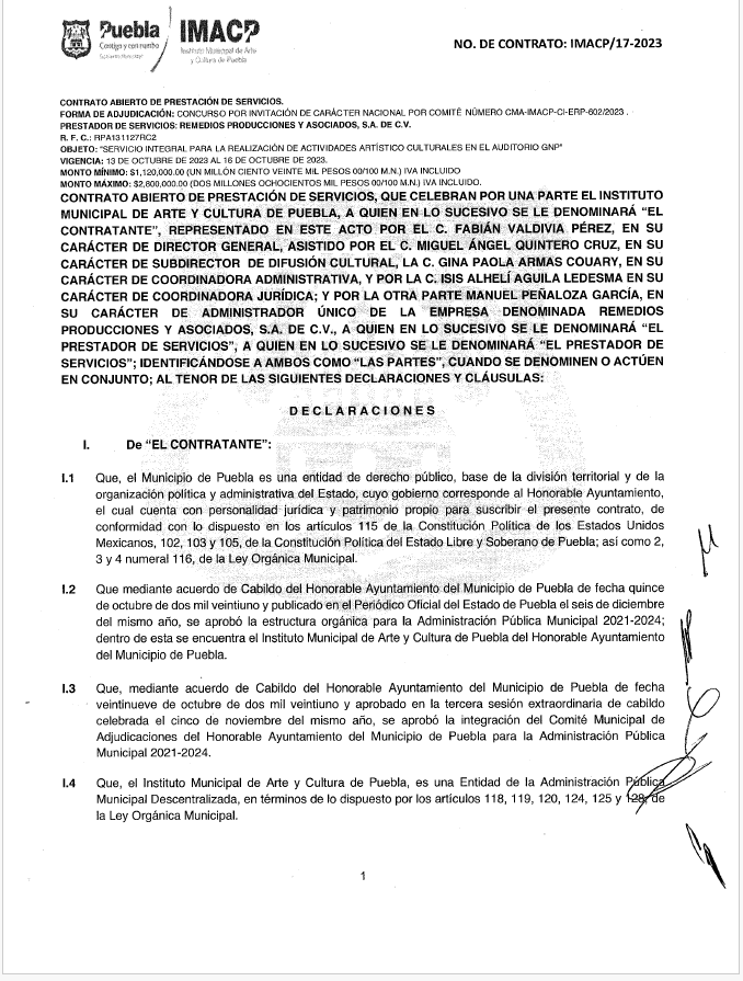 Pese a todas las sospechas alrededor de la compañía Remedios Producciones y Asociados, en octubre del año pasado, el Ayuntamiento de Puebla contrató a la firma para el destape del entonces edil Eduardo Rivera, cuyo costo fue de hasta 2.8 millones de pesos a través del Instituto Municipal de Arte y Cultura (IMACP).