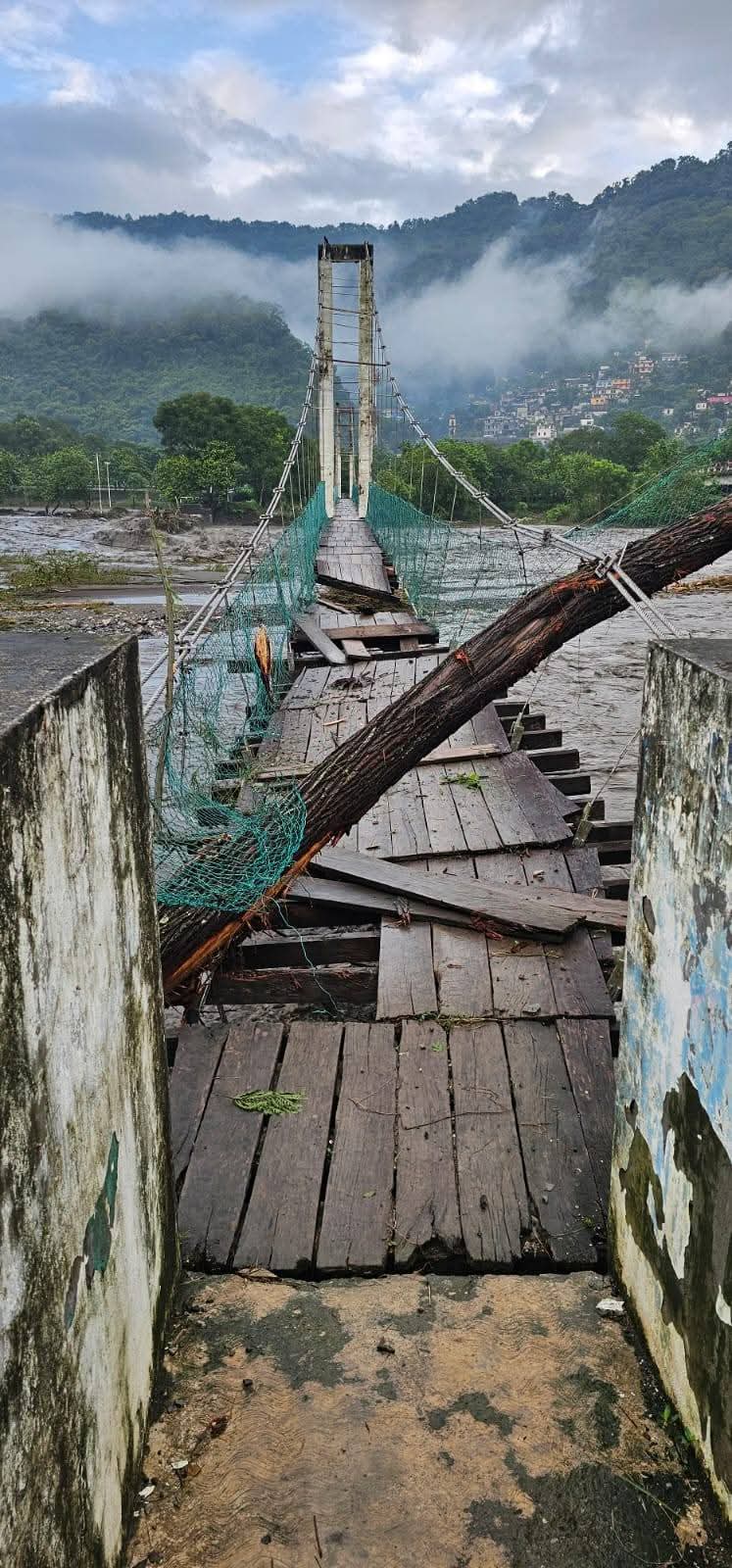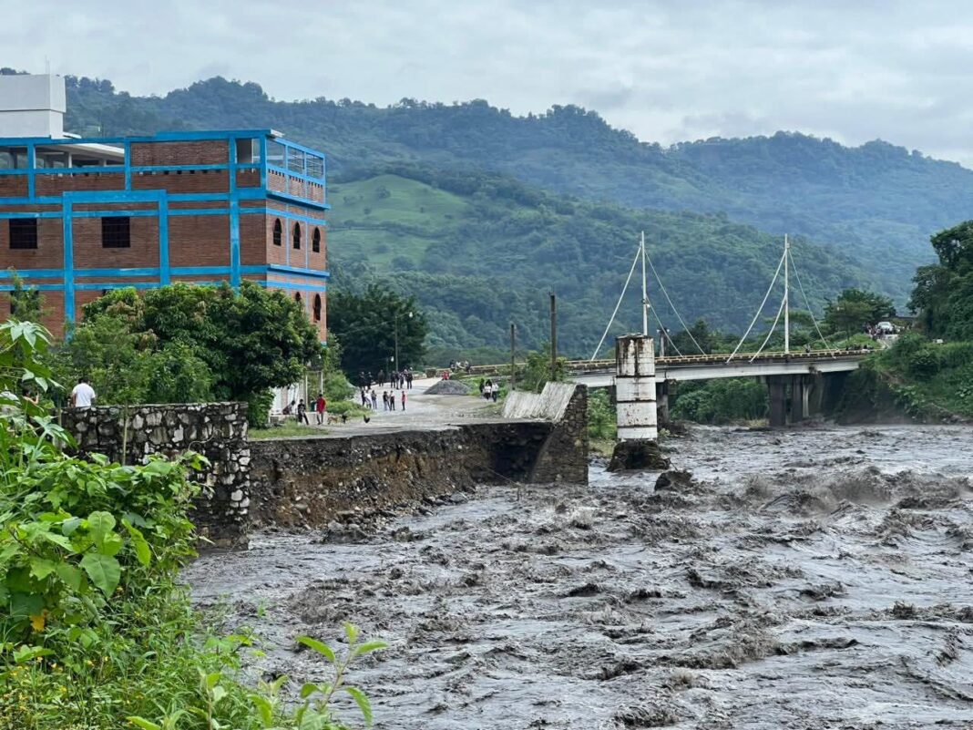 Nos trasladamos hacia el río. Subimos al puente vehicular y observo el daño que la corriente le causó al puente colgante. Todavía el afluente de agua es bastante, pero ha disminuido. Mi hermano dice que le faltó como metro y medio para que el torrente de aguas cafetosas alcanzara el puente. Con el celular hago varias tomas.