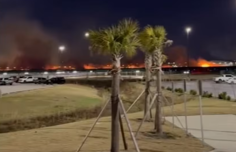 Videos compartidos en redes sociales mostraron amplios anillos de fuego y una densa bruma anaranjada junto a la pista, mientras se escuchaban fuertes ráfagas de viento.