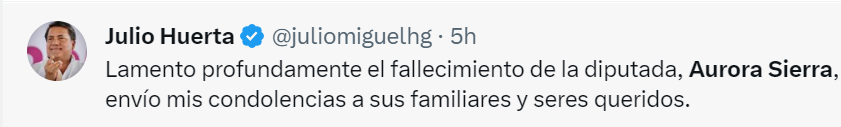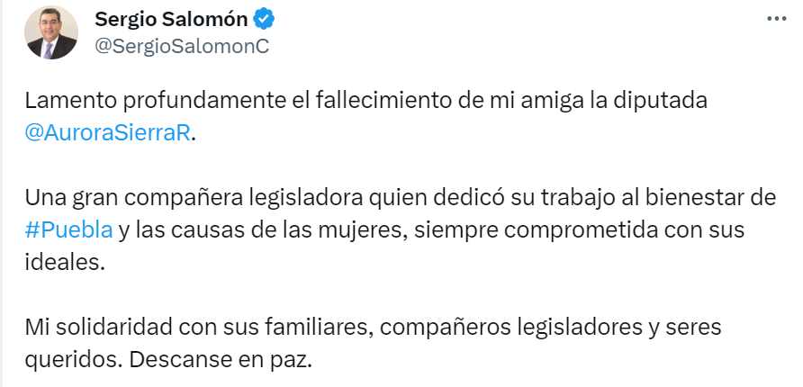 “Las palabras son insuficientes para expresar la tristeza que sentimos ante la inesperada partida de nuestra querida amiga Aurora Sierra, quien fungió como presidenta de la Mesa Directiva del @CongresoPue Envío mi más sentido pésame a su familia y amigos. Descanse en paz”, declaró en redes sociales.