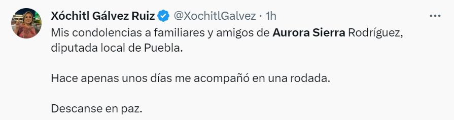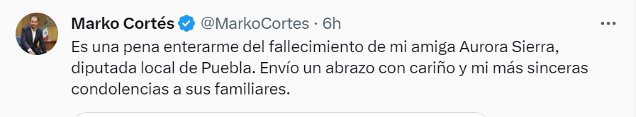 “Es una pena enterarme del fallecimiento de mi amiga Aurora Sierra, diputada local de Puebla. Envío un abrazo con cariño y mis más sinceras condolencias a sus familiares”, expresó Cortés Mendoza.