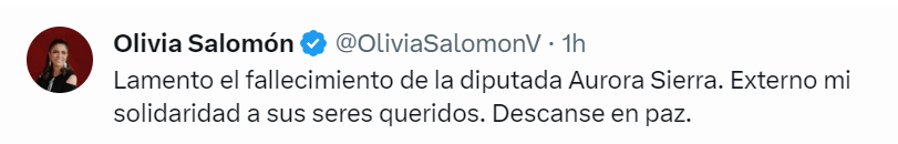 El gobernador Sergio Salomón Céspedes Peregrina manifestó a través de redes sociales su solidaridad para la familia de la diputada fallecida, a quien reconoció su trabajo en favor de las causas sociales, y en especial su enfoque en favor de las mujeres.