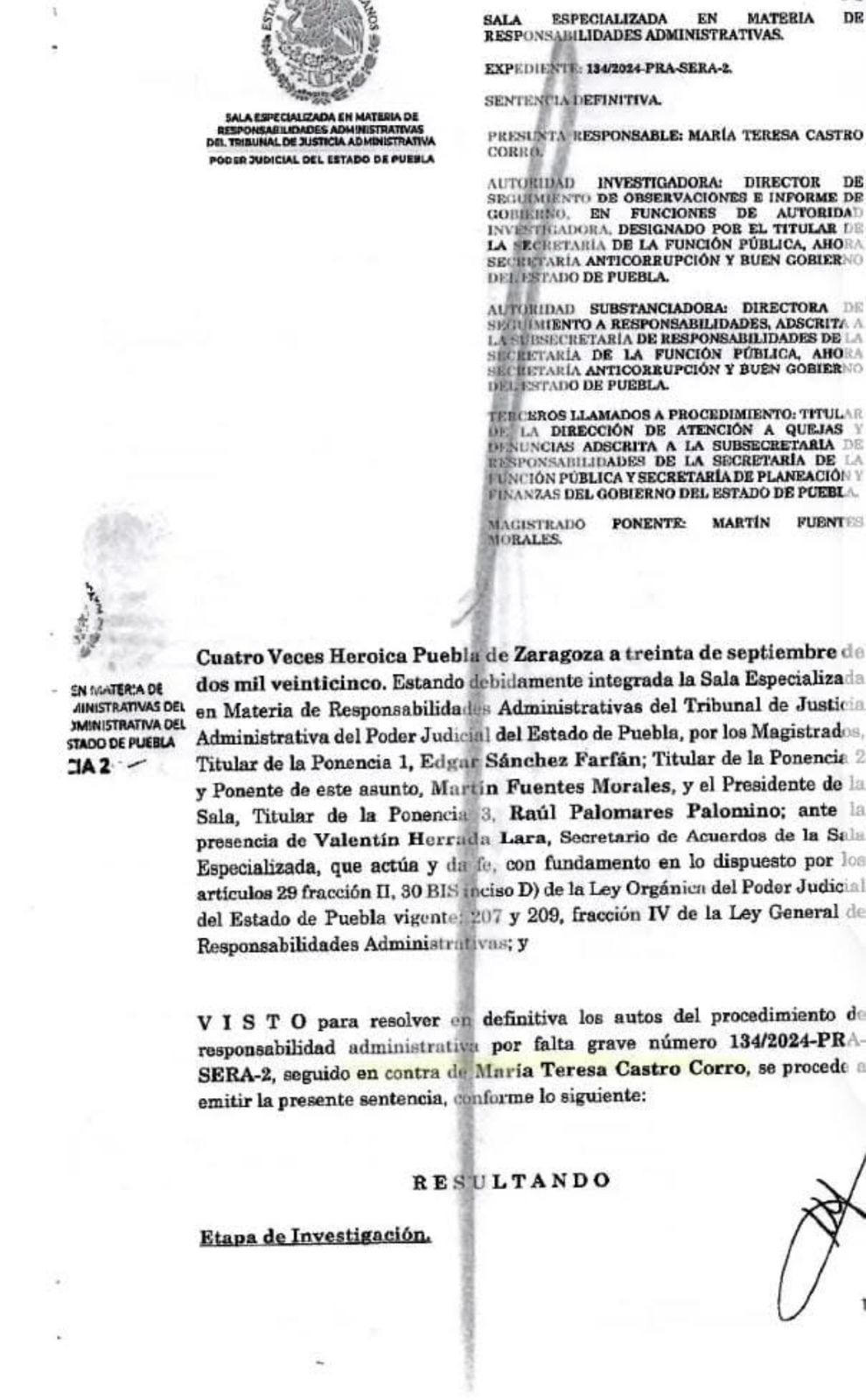 La exsecretaria de Planeación y Finanzas del Gobierno de Puebla, María Teresa Castro Corro, fue sancionada con 20 años de inhabilitación y una multa de 362.9 millones de pesos, luego de que un tribunal especializado la encontrara responsable de desvío de recursos públicos y abuso de funciones.