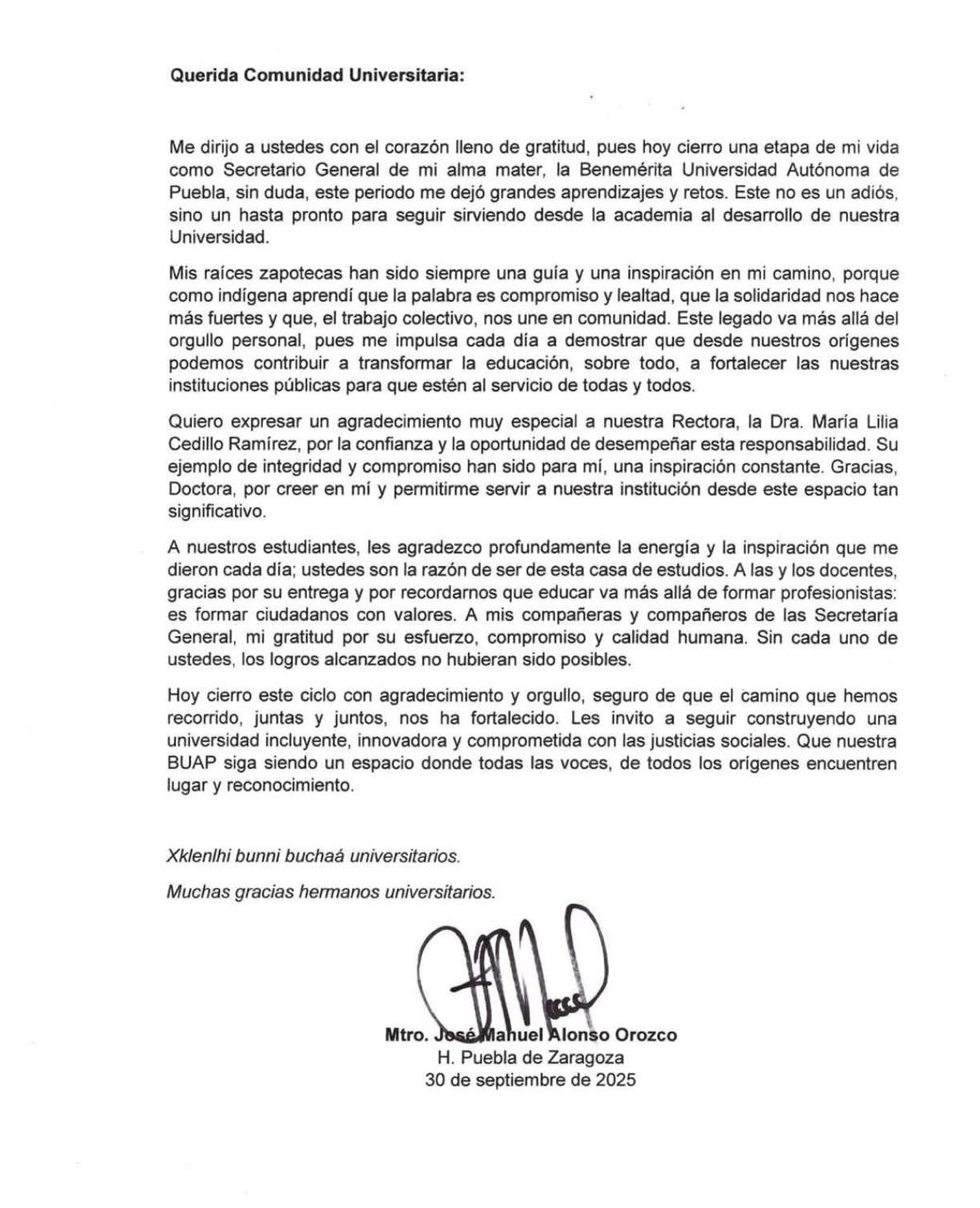 A unos días del cierre del periodo 2021 – 2025, José Manuel Alonso Orozco se despidió formalmente de la Secretaría General de la Benemérita Universidad Autónoma de Puebla (BUAP), agradeciendo la confianza de la rectora, María Lilia Cedillo Ramírez.