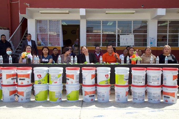 Con el objetivo de fortalecer la infraestructura educativa, la secretaria de Bienestar, Laura Artemisa García Chávez, entregó 18 botes de impermeabilizante y seis botes de pintura en la Escuela Primaria Leona Vicario, ubicada en la junta auxiliar de San Jerónimo Caleras, en coordinación con la Secretaría de Educación Pública (SEP).