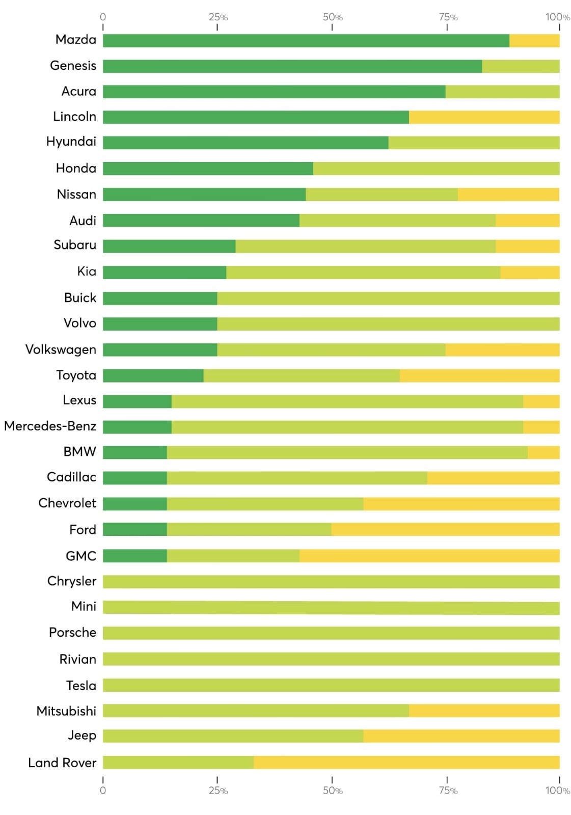 La firma japonesa se colocó en el primer lugar con una calificación cercana al 90%, por encima de competidores como Genesis —la división de lujo de Hyundai—, que ocupó la segunda posición, y Acura, en tercero. El Top 5 lo completan Hyundai y Honda.