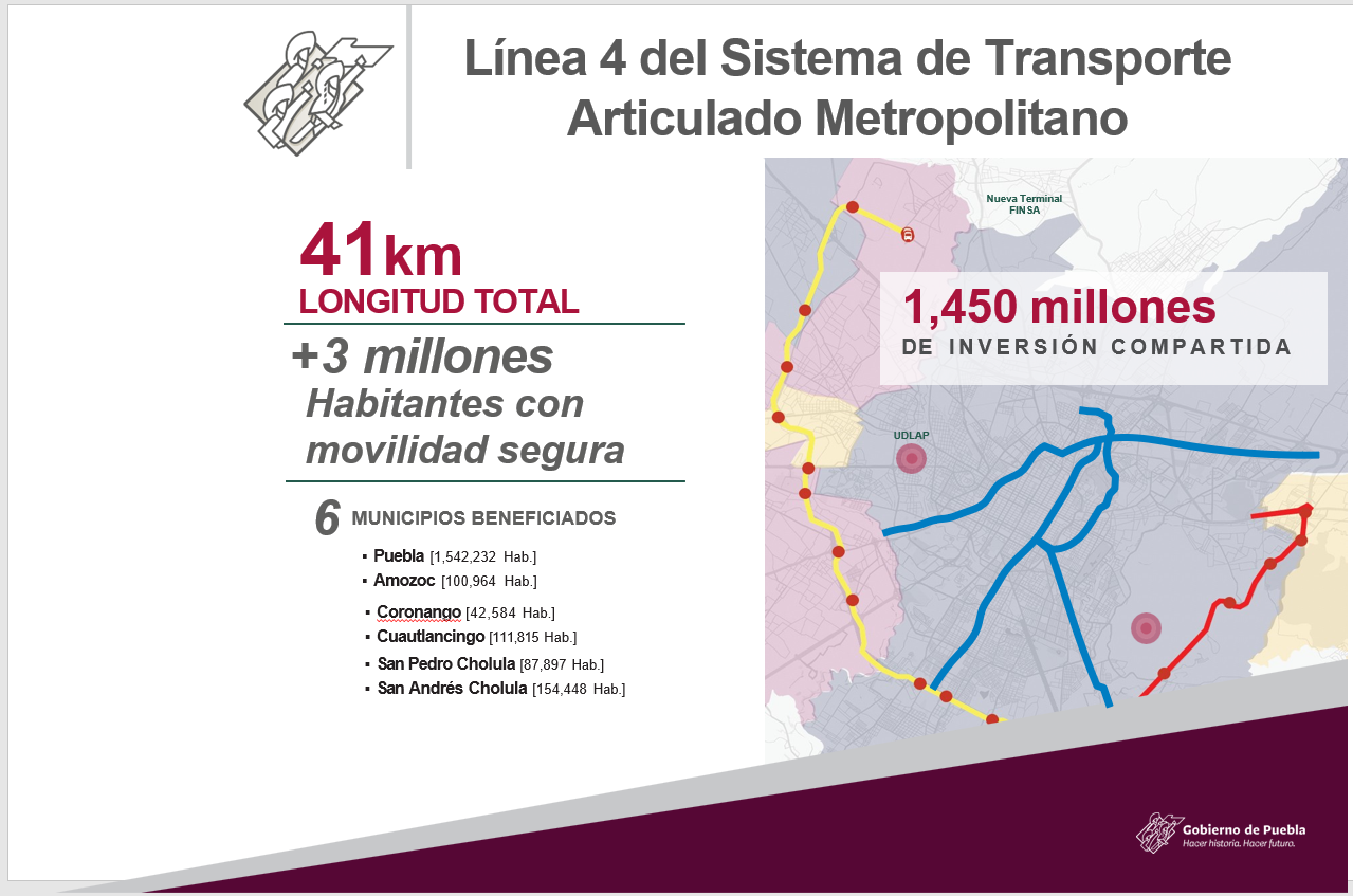 Pero lo más importante, indicó, es que con el proyecto no se busca perjudicar a nadie sino buscar un amplio beneficio para los poblanos, que se vea reflejado en la disminución de sus tiempos de traslado y que pueda contar hasta con dos horas más para su uso personal y destinarlo a sus actividades personales.
