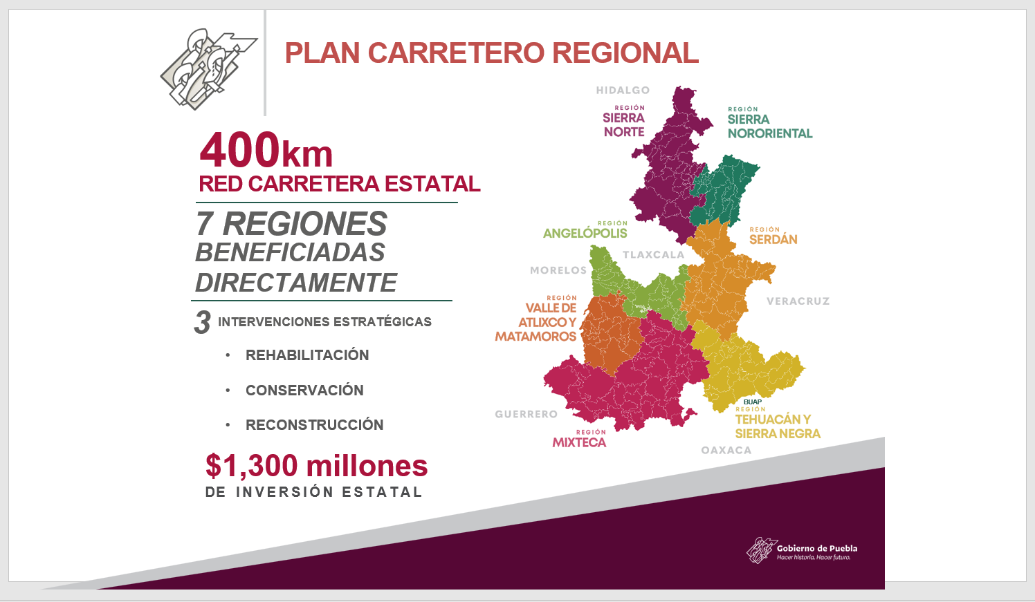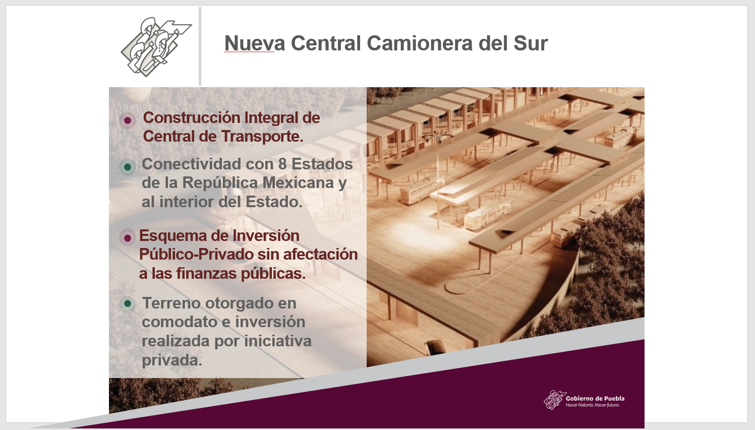 Céspedes Peregrina enfatizó que los proyectos tienen el objetivo de resolver problemas y necesidades, algunas de antaño, como la construcción de una nueva Central Camionera, ya que Puebla solo cuenta con una terminal, la cual fue construida en los años 70.