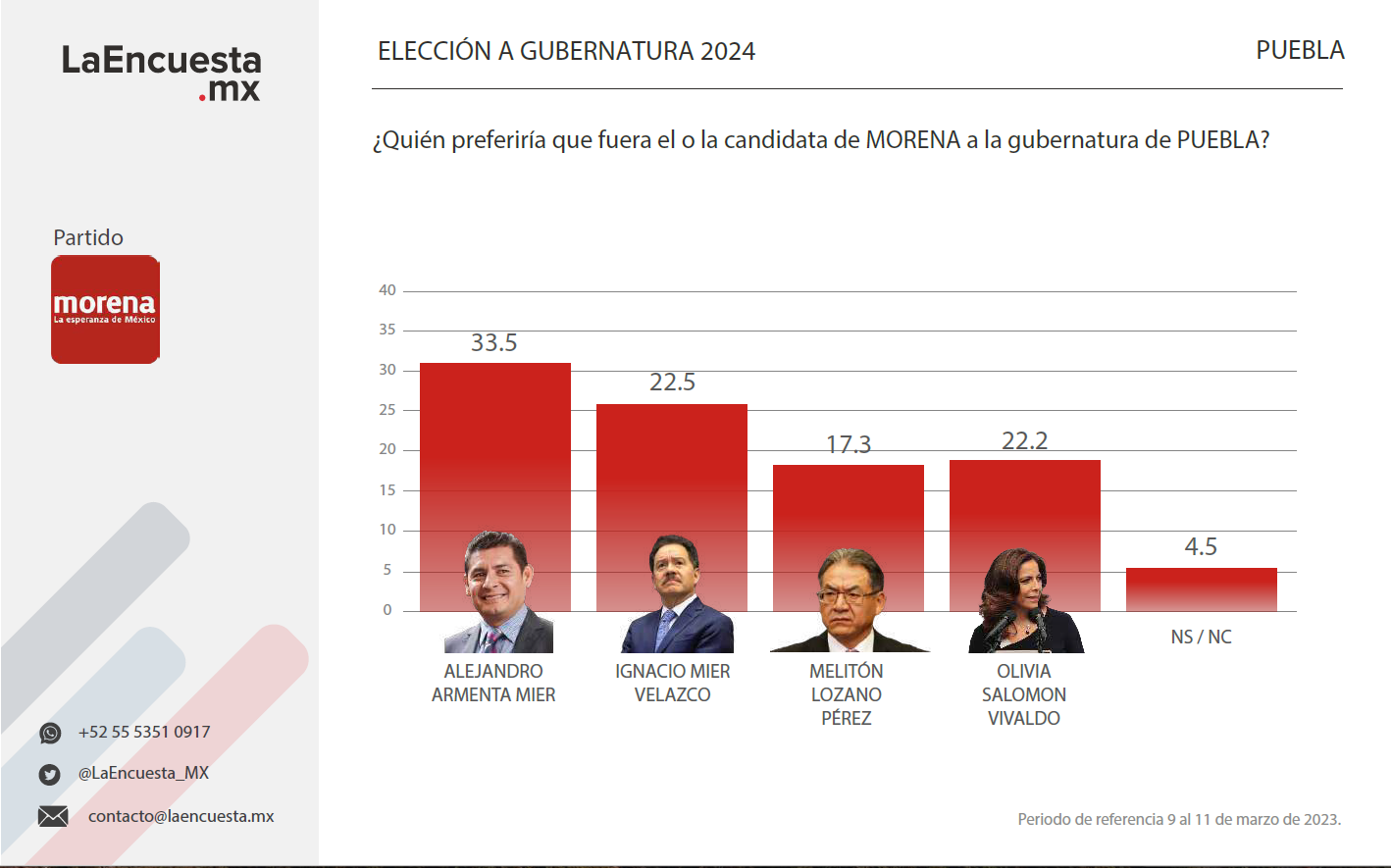 Como puntero al interior de Morena para la candidatura a la gubernatura de Puebla aún se encuentra el senador Alejandro Armenta, quien tiene una intención de voto de 33.5 por ciento, lo que evidencia un aumento con respecto a encuesta pasada, en la que registró 31.9 por ciento, lo que pone a Olivia Salomón a 11.3 puntos porcentuales del líder en las encuestas.