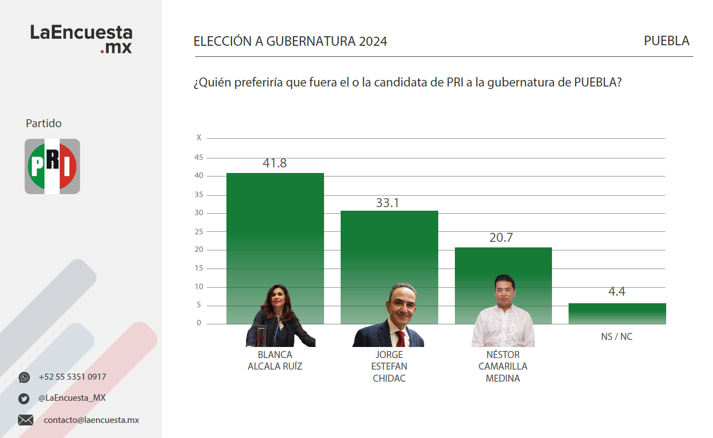 En el PRI, la opinión más fuerte es la diputada federal Blanca Alcalá Ruiz, con 41.8 por ciento de la preferencia; le sigue Jorge Estefan Chidiac, coordinador de la bancada en el Congreso local, con 33.1 por ciento del apoyo, y el dirigente Néstor Camarillo Medina, con 20.7 por ciento de la intención de voto.