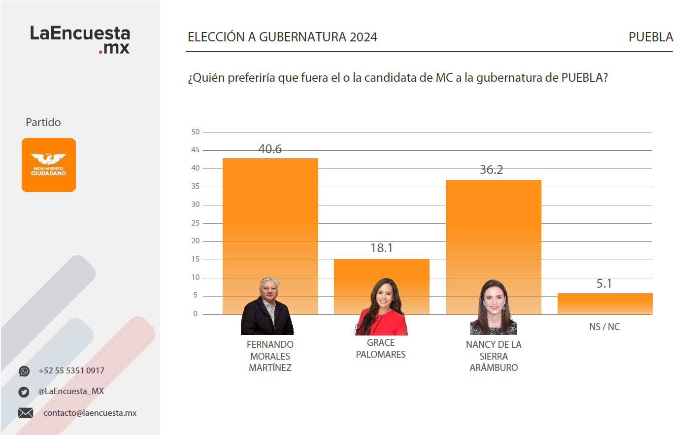 En Movimiento Ciudadano el perfil más competitivo es el dirigente Fernando Morales Martínez, con 40.6 por ciento; seguido por la senadora Nancy De la Sierra Arámburo, con 36.2 por ciento, y la exdiputada local Grace Palomares, que tiene una intención de voto del 18.1 por ciento.