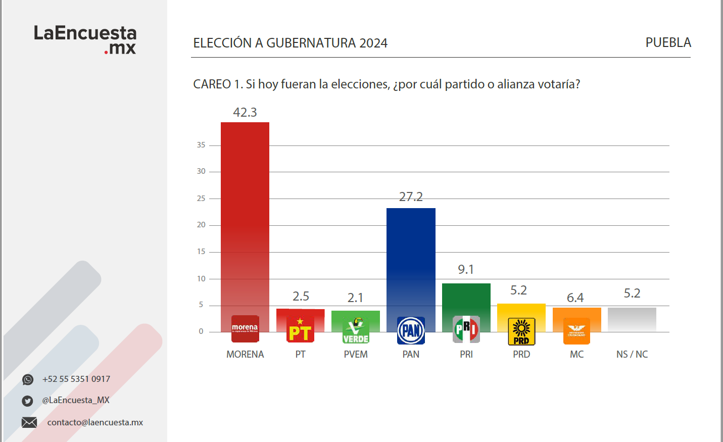 A la pregunta “Si hoy fueran las elecciones, ¿por cuál partido o alianza votaría?”, 42.3 por ciento de los encuestados respondió que su elección sería a favor de Morena, 27.2 señaló que su preferencia se iría con el Partido Acción Nacional (PAN), 9.1 por ciento elegiría al Partido Revolucionario Institucional (PRI), Movimiento Ciudadano cuenta con un respaldo de 6.4, el Partido de la Revolución Democrática (PRD) muestra 5.2 de apoyo, el Partido del Trabajo (PT) tiene 2.5 y el Verde Ecologista de México (PVEM), 2.1.