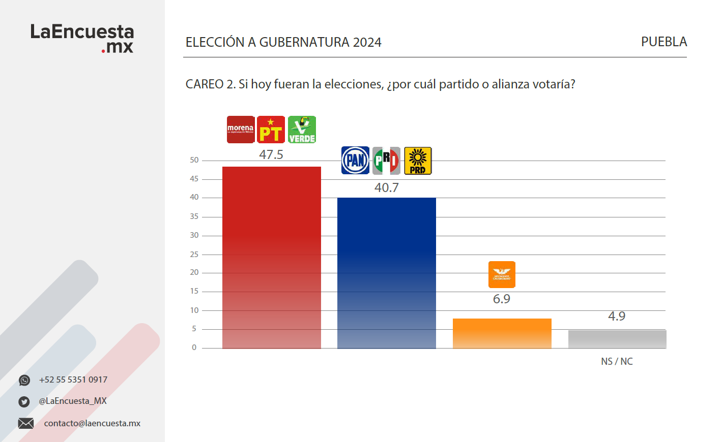 Cuando se pregunta por su preferencia en cuanto a las alianzas partidistas, la coalición Juntos Hacemos Historia (Morena-PT-PVEM) obtiene una votación de 47.5 por ciento, lo que le aporta a Morena 5.2 puntos porcentuales más; mientras que la alianza Va Por Puebla, formada por PRI, PAN y PRD, se queda con 40.7 por ciento de los votos, sumándole 13.5 puntos al partido blanquiazul.
