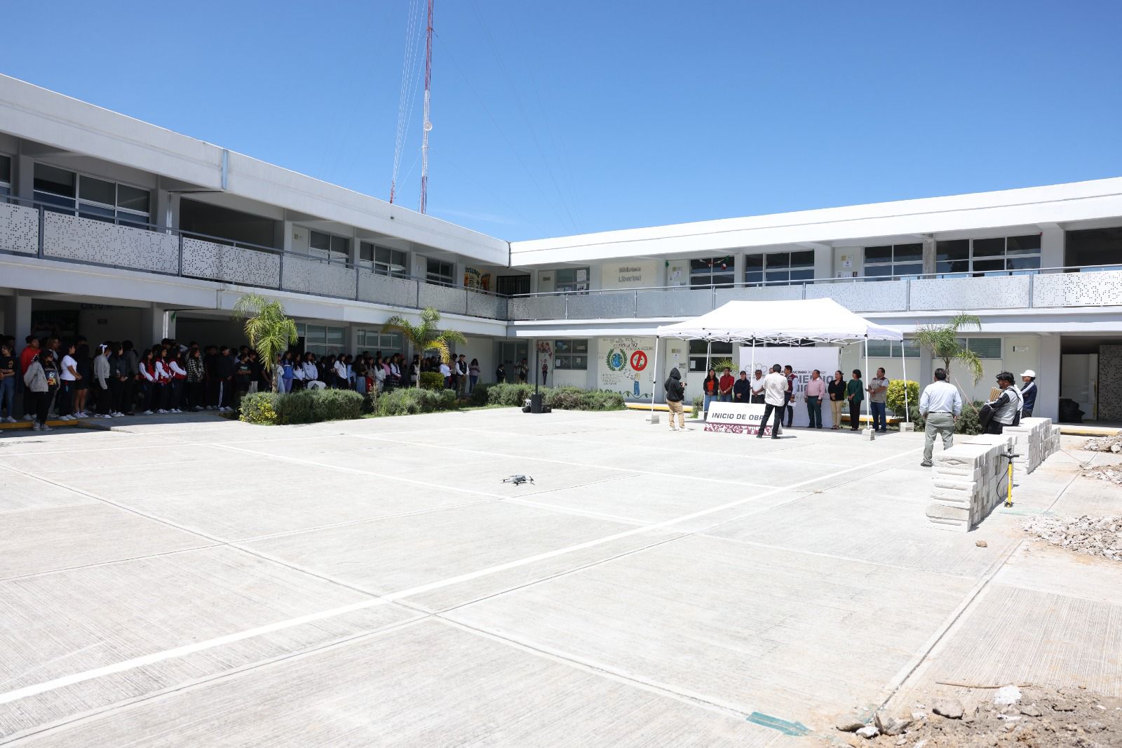 Durante el acto, el edil inauguró el arco techo del preescolar “Unidad Educativa Frida Kahlo” en la junta auxiliar de Sanctorum y dio inicio a la techumbre del bachillerato “Almecatla”, en San Lorenzo Almecatla, beneficiando directamente a cientos de alumnos.