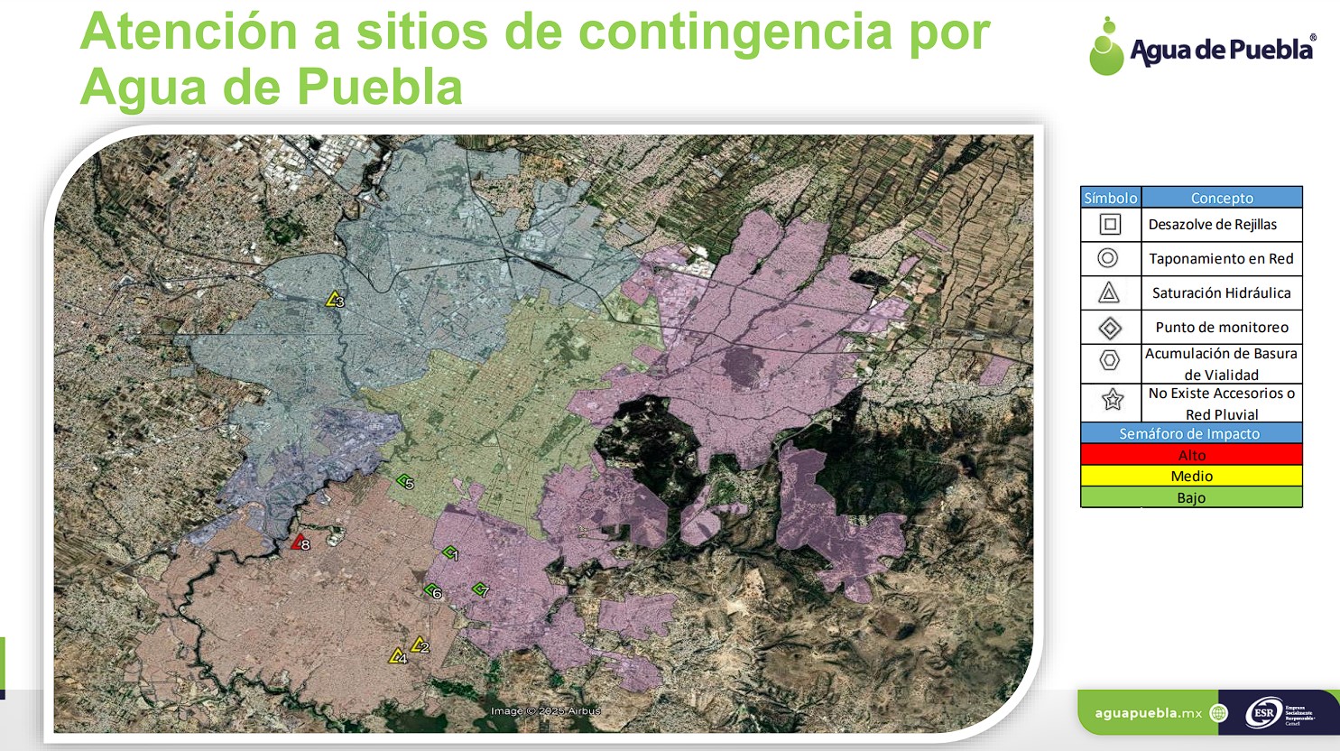 Tras la fuerte lluvia en Puebla capital registrada la noche del martes, el Gobierno de la Ciudad en coordinación con Agua de Puebla activó un operativo especial de respuesta inmediata para atender ocho puntos críticos, principalmente en la zona sur, donde se reportó una acumulación de agua de 32.0 mm, según la estación de monitoreo Quetzalcóatl (Atlaco-Rabanillo).
